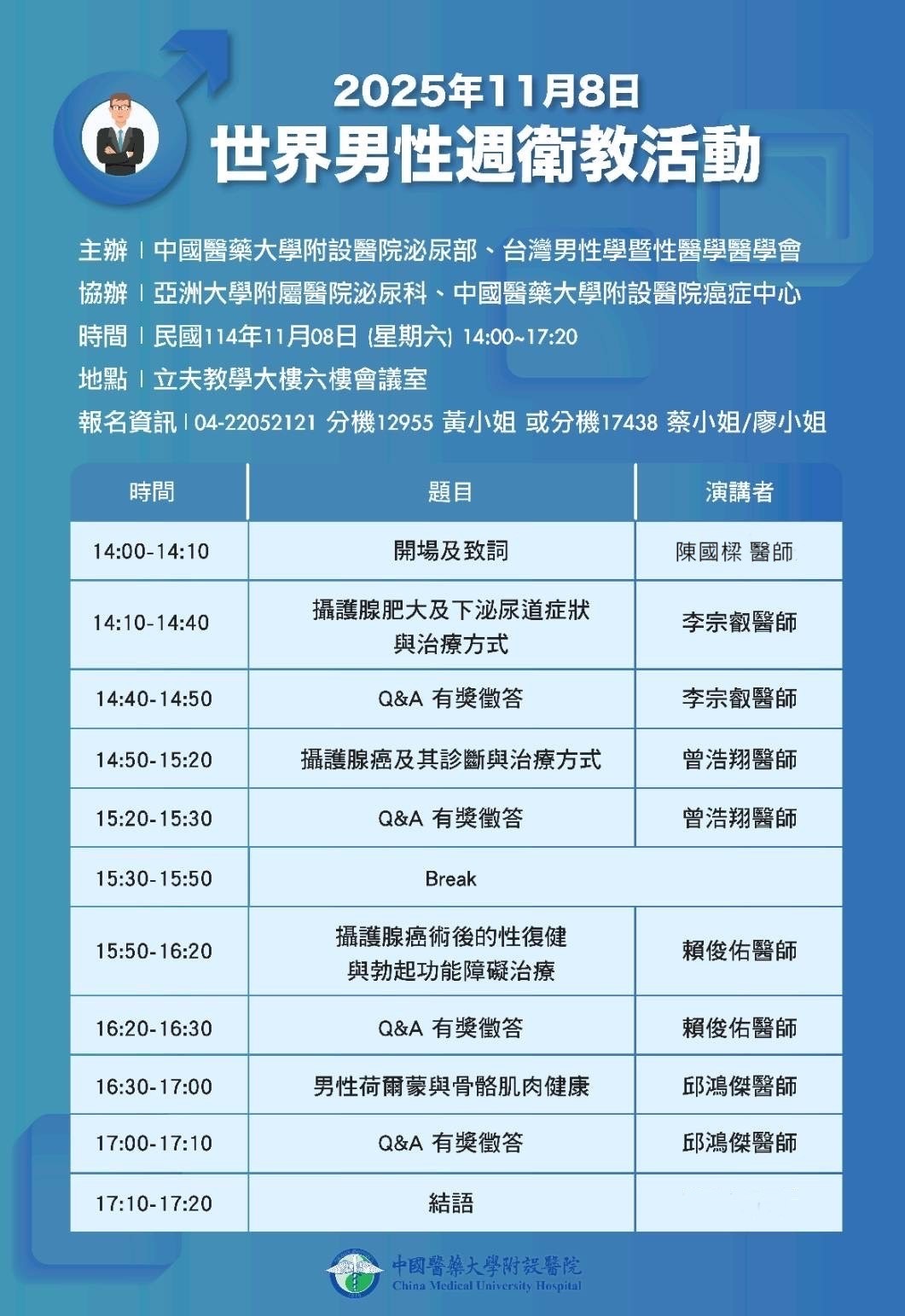 為響應「世界男性週(World Men’s Health Week)」並提升男性民眾對攝護腺及生殖泌尿健康的重視,中國醫藥大學附設醫院泌尿部與台灣男性學暨性醫學醫學會共同主辦「2025世界男性週衛教活動」,並由亞洲大學附屬醫院泌尿科及中醫大附醫癌症中心協辦。